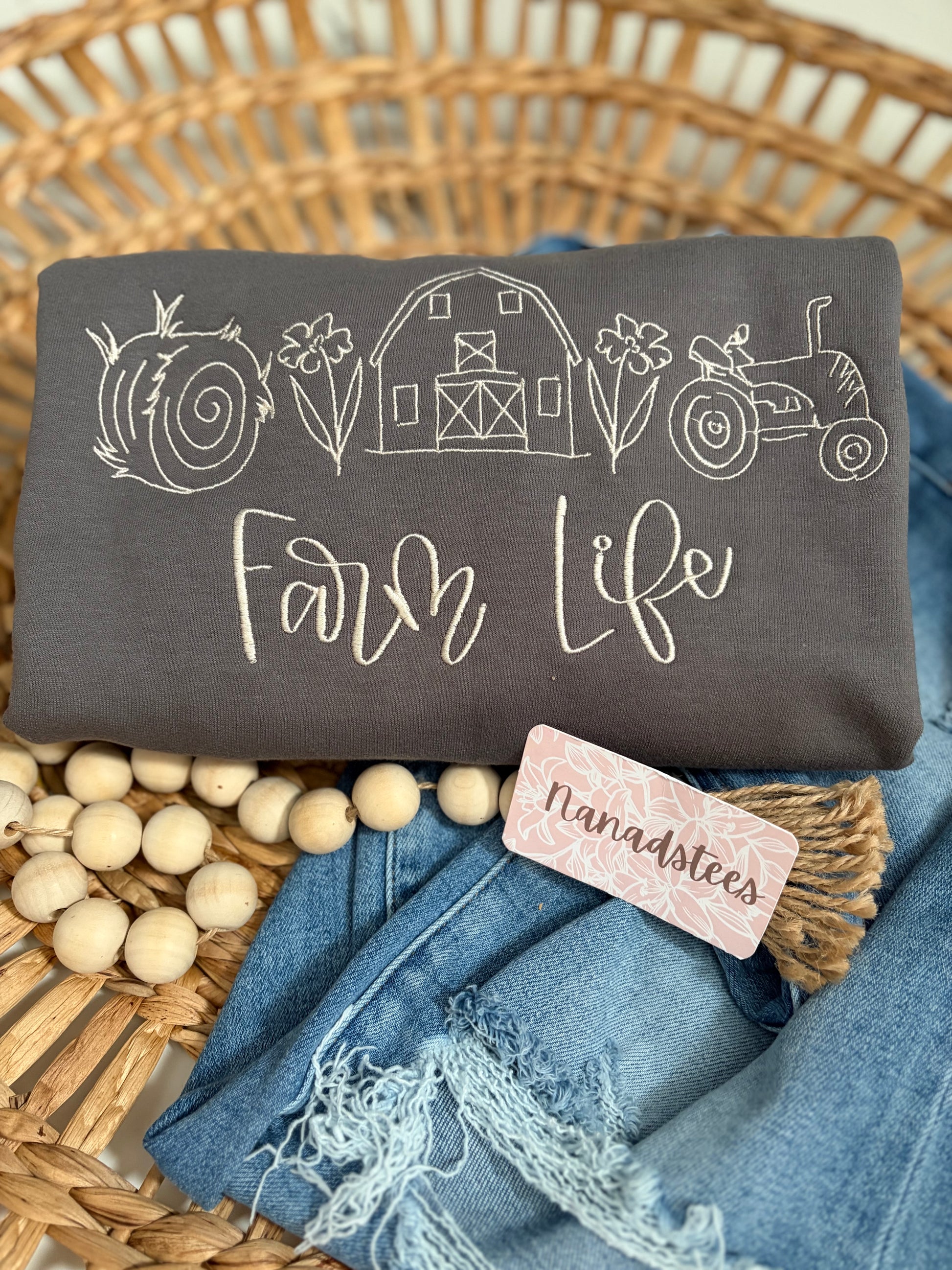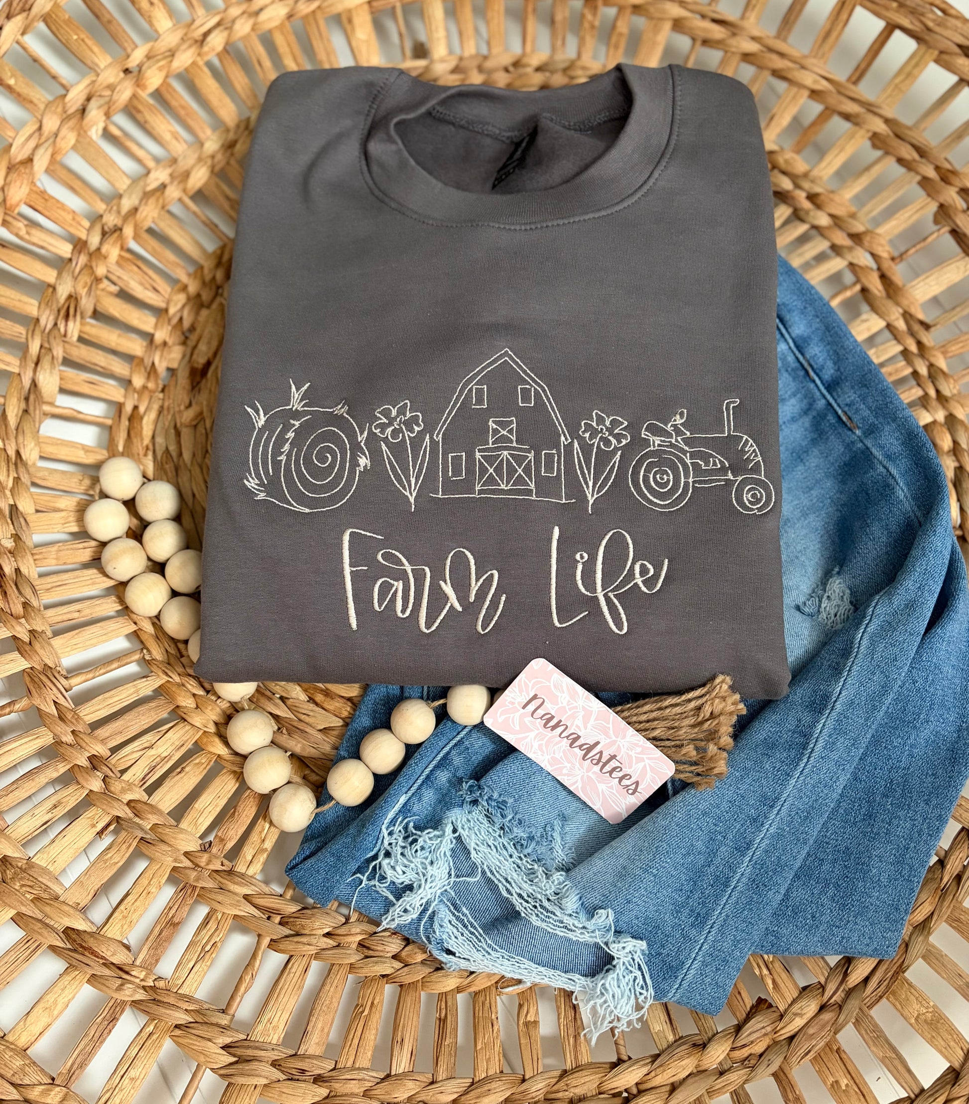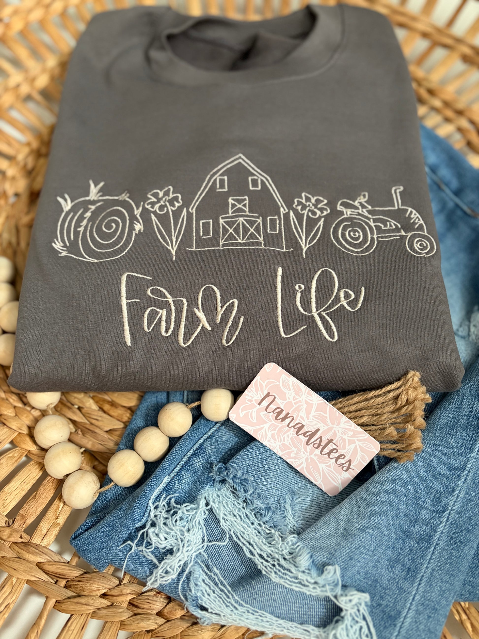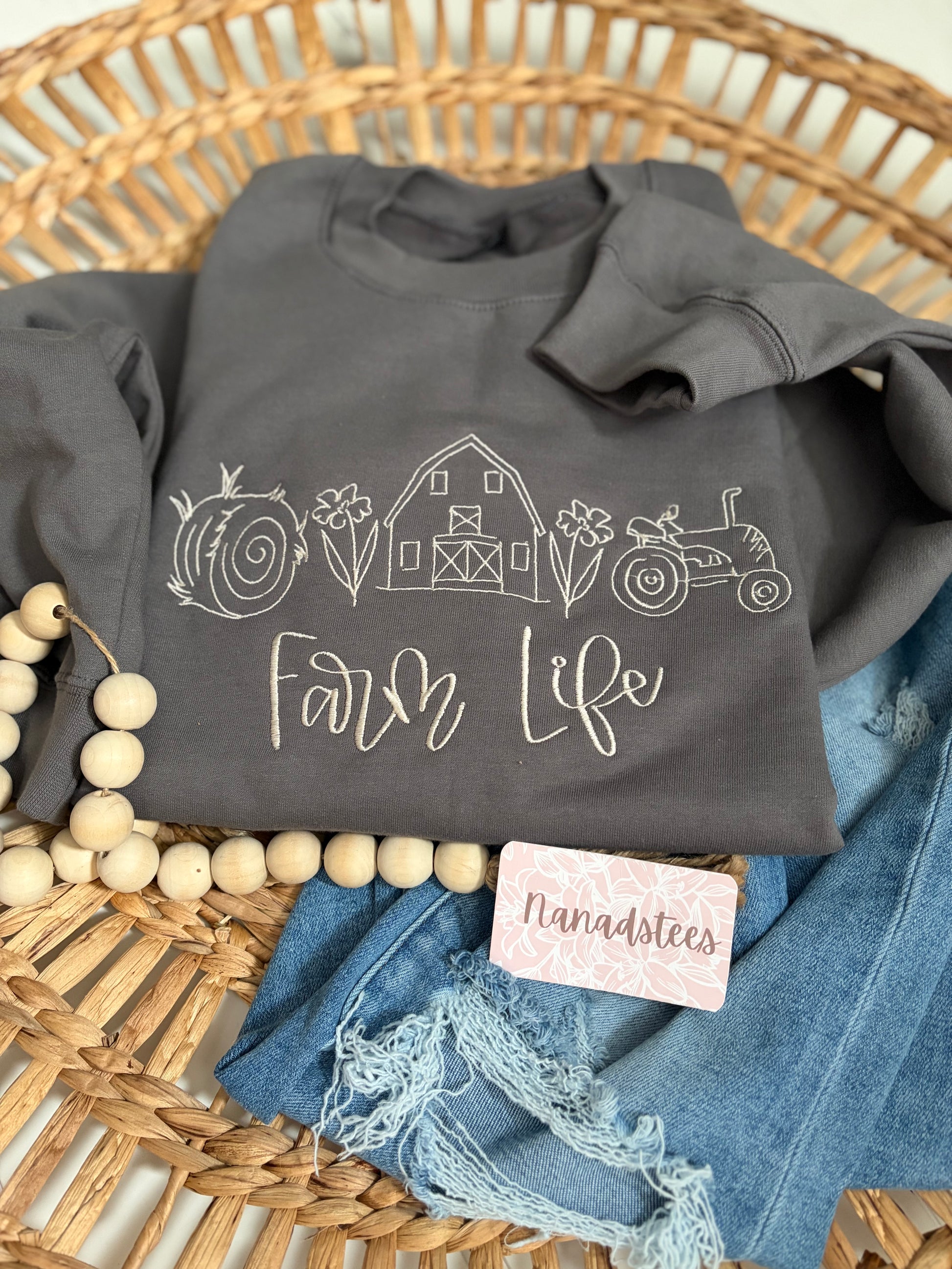 Embrace rural charm with this cozy embroidered crewneck sweatshirt. Featuring "Farm Life" detailing, it's perfect for country lovers and those who appreciate agricultural aesthetics. The soft, comfortable fit makes it ideal for casual wear, whether you're working outdoors or relaxing at home. A versatile wardrobe staple that celebrates a simpler way of life.
