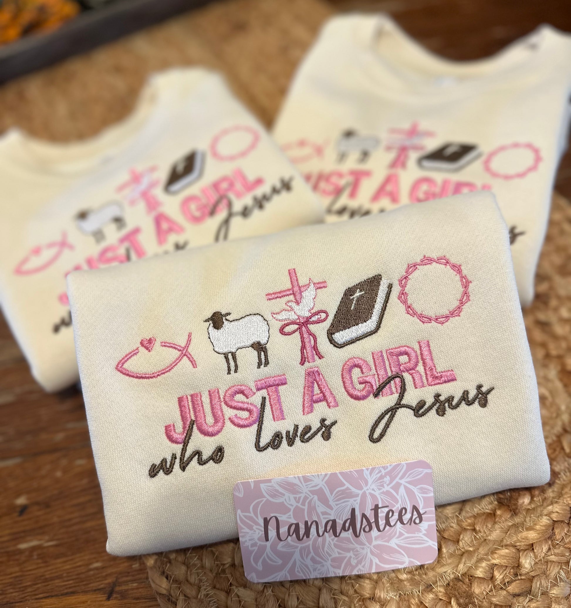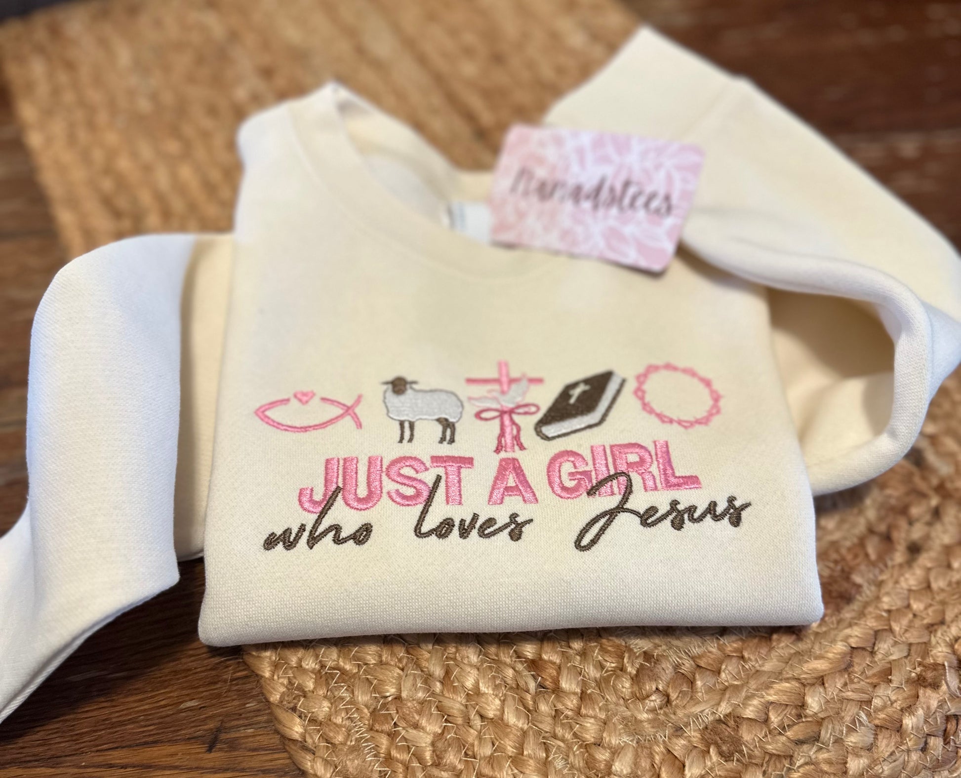 Designed for young believers, this expertly crafted kids’ crewneck showcases detailed embroidery with the inspiring message “Just a Girl Who Loves Jesus.” Its soft fabric ensures comfort during church services and daily wear, combining quality and faith in every stitch.