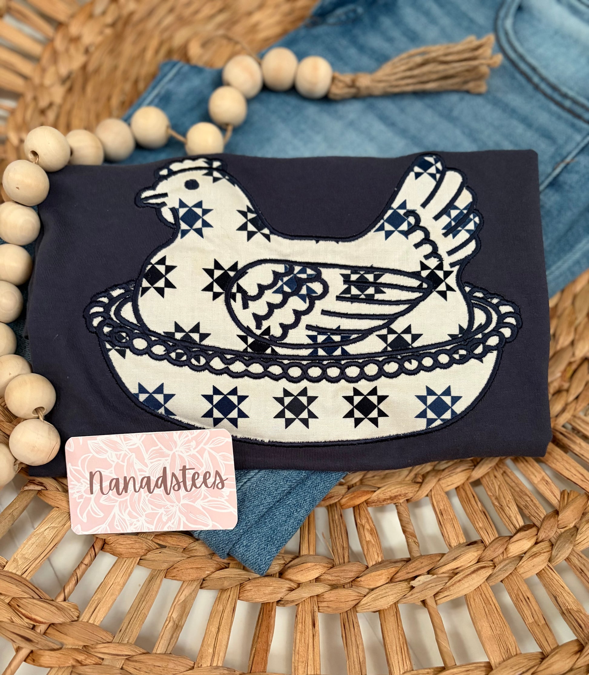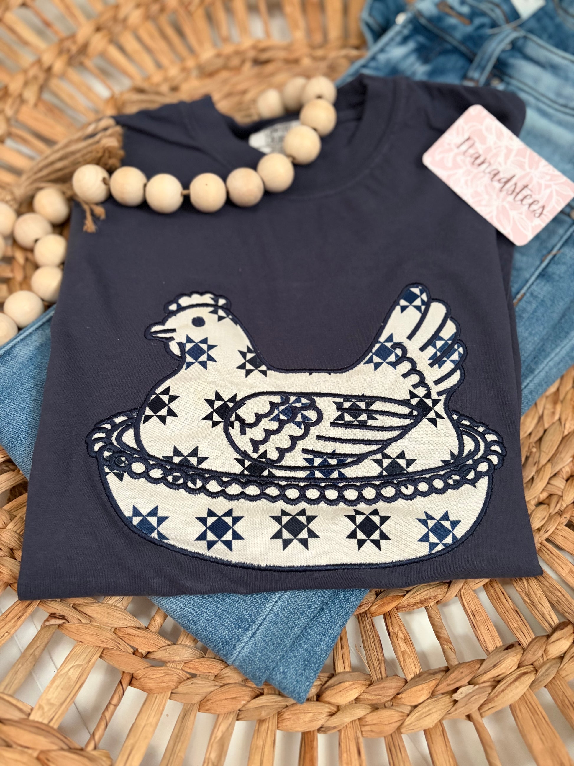 Celebrate farm life with this charming Laying Hen applique t-shirt. Featuring detailed embroidered design work, this comfort-fit tee showcases a delightful hen motif perfect for poultry lovers and homesteaders. Crafted from soft, breathable fabric, it's ideal for casual wear that makes a statement. Whether you're tending to your flock or simply appreciate country style, this versatile piece brings warmth and personality to your everyday wardrobe.