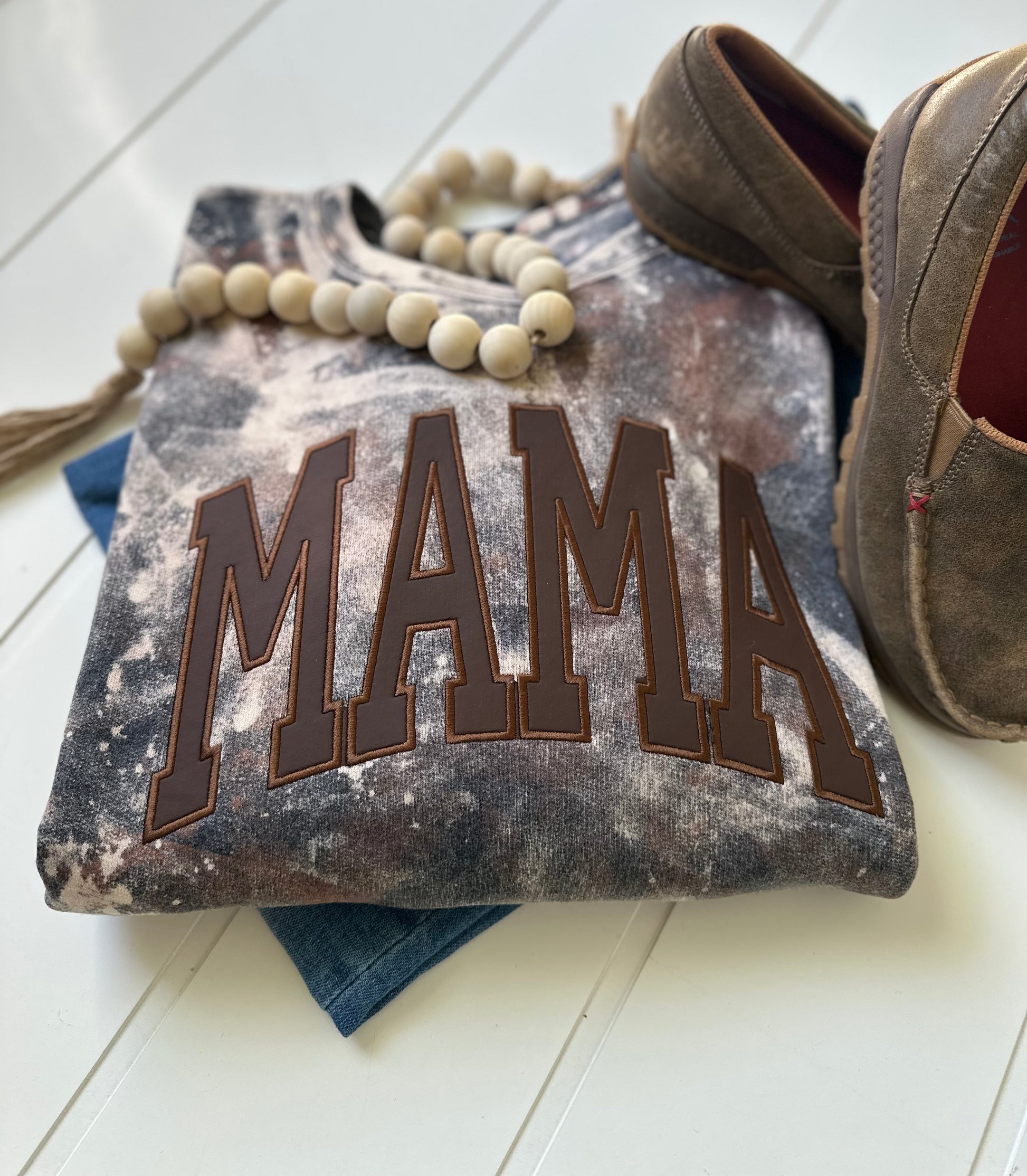 Get cozy with the Mama applique cowhide bleached crew, featuring playful embroidery and a unique matte brown applique design. This stylish crewneck adds a touch of fun and warmth to your outfit while standing out with its one-of-a-kind cowhide detail. Perfect for those who love comfort with a creative twist!