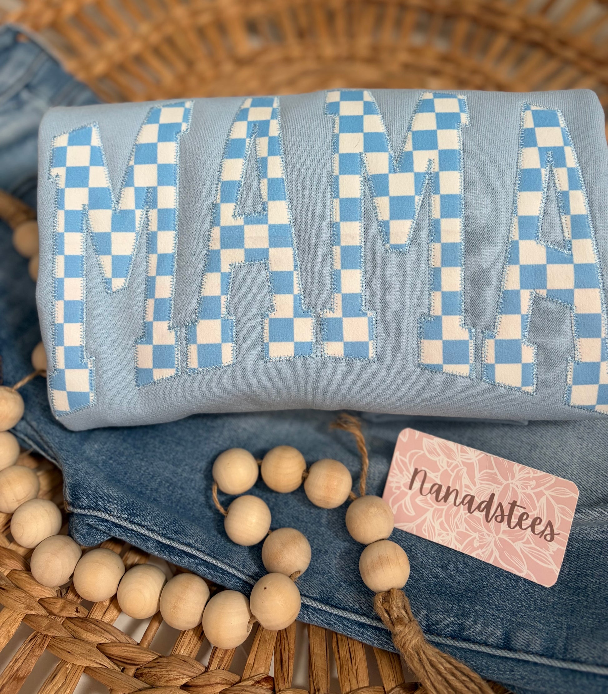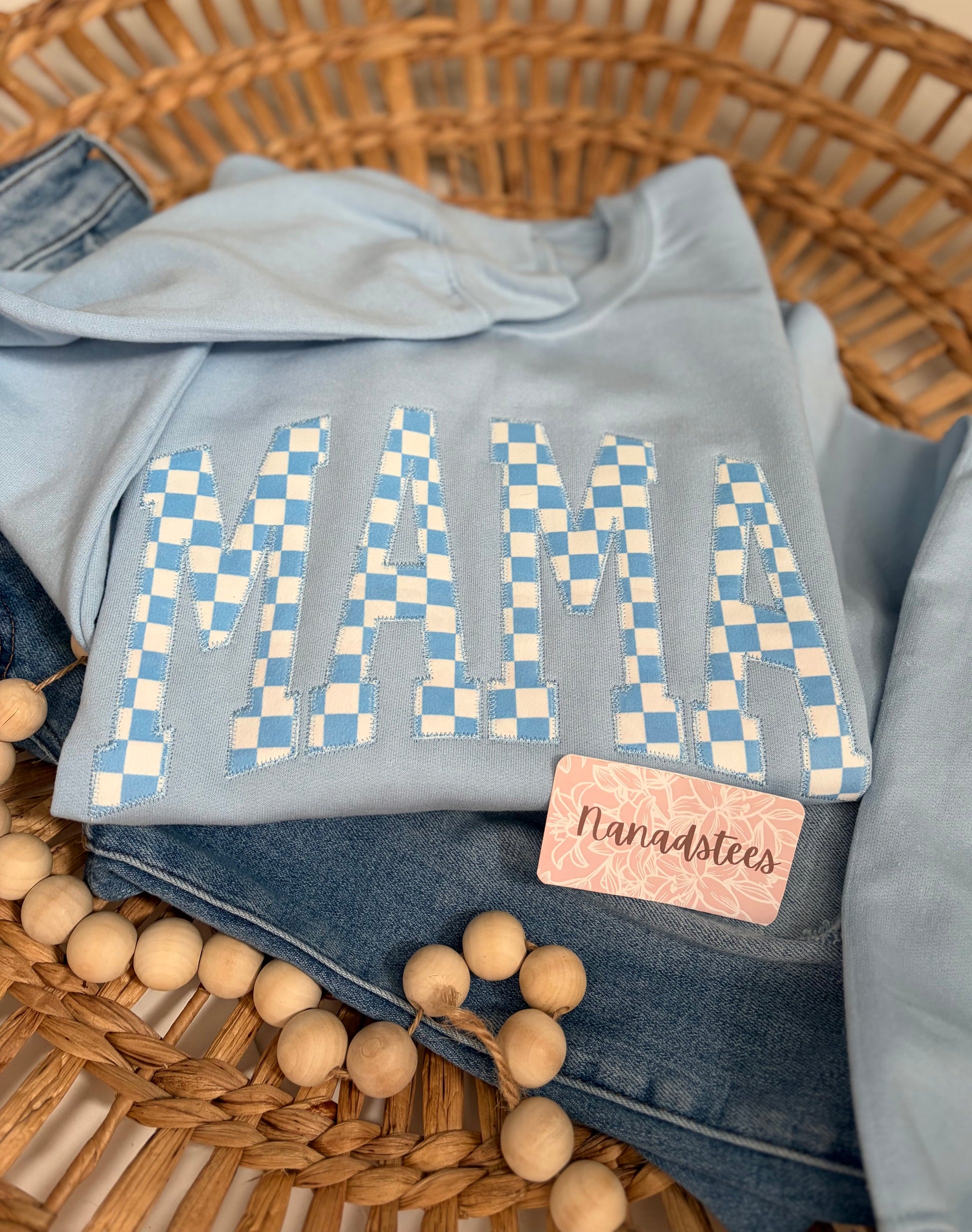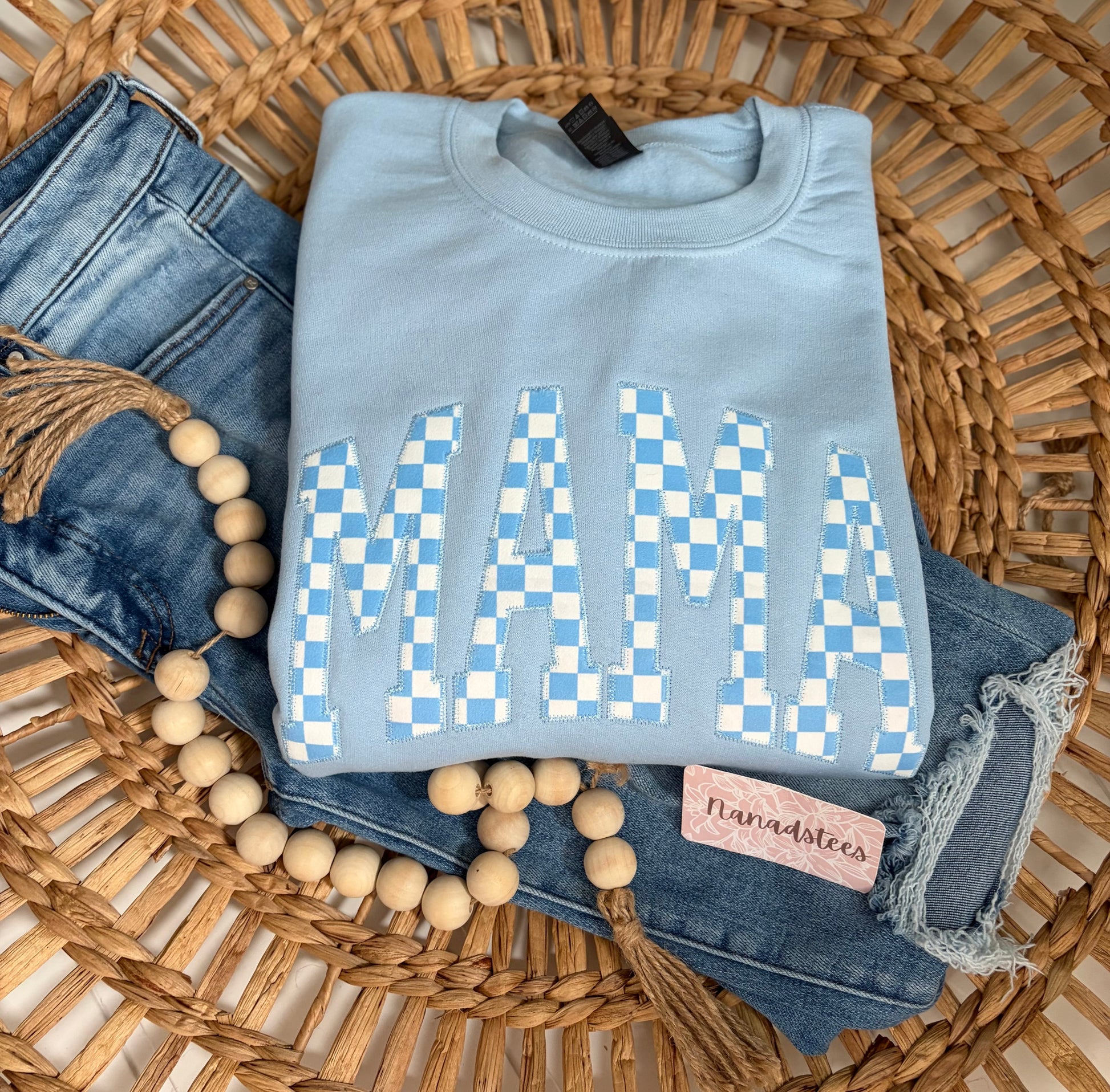 Cozy up in this charming MAMA checkered crewneck sweatshirt, featuring a soft blue palette with classic checkered detailing. The adorable applique and embroidered accents add a personal touch that celebrates motherhood with style. Perfect for everyday wear, this comfortable sweatshirt pairs effortlessly with jeans or loungewear for a relaxed, put-together look. Ideal for moms who want to express their identity while staying warm and comfortable.
