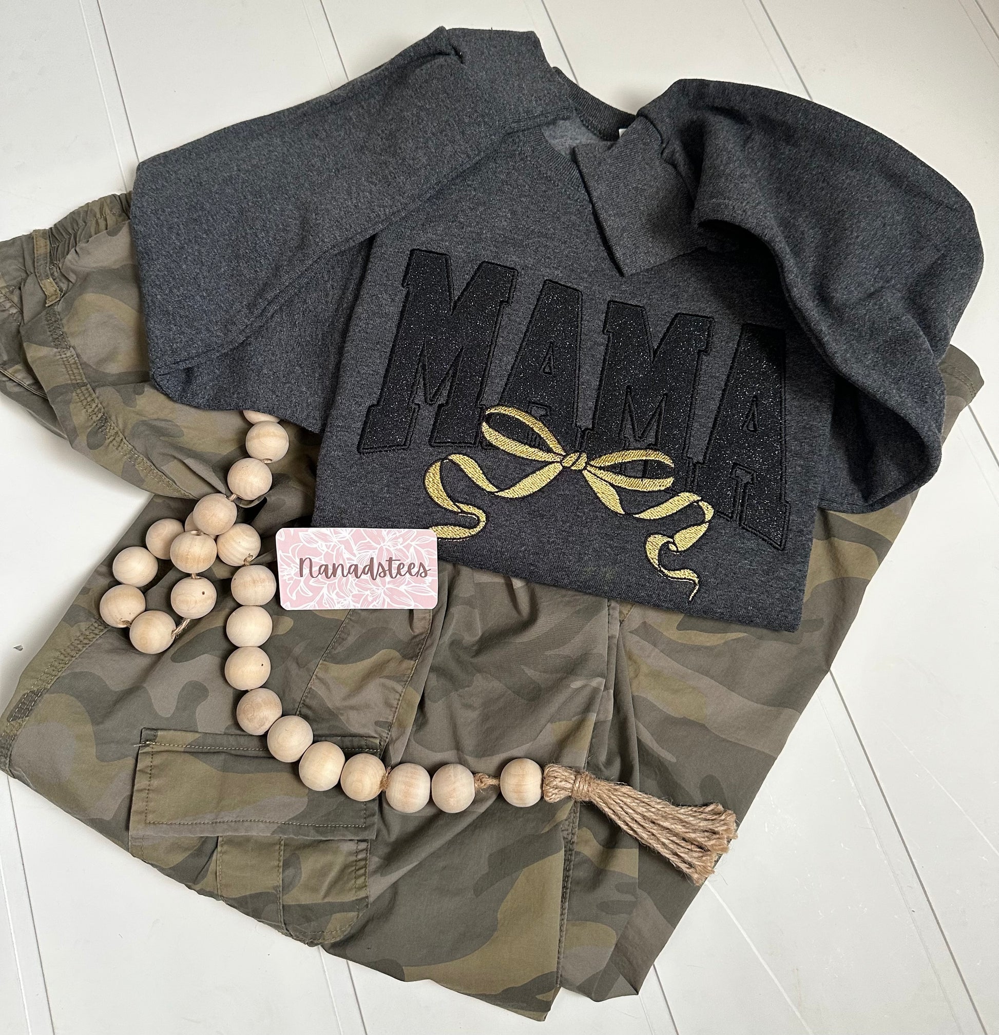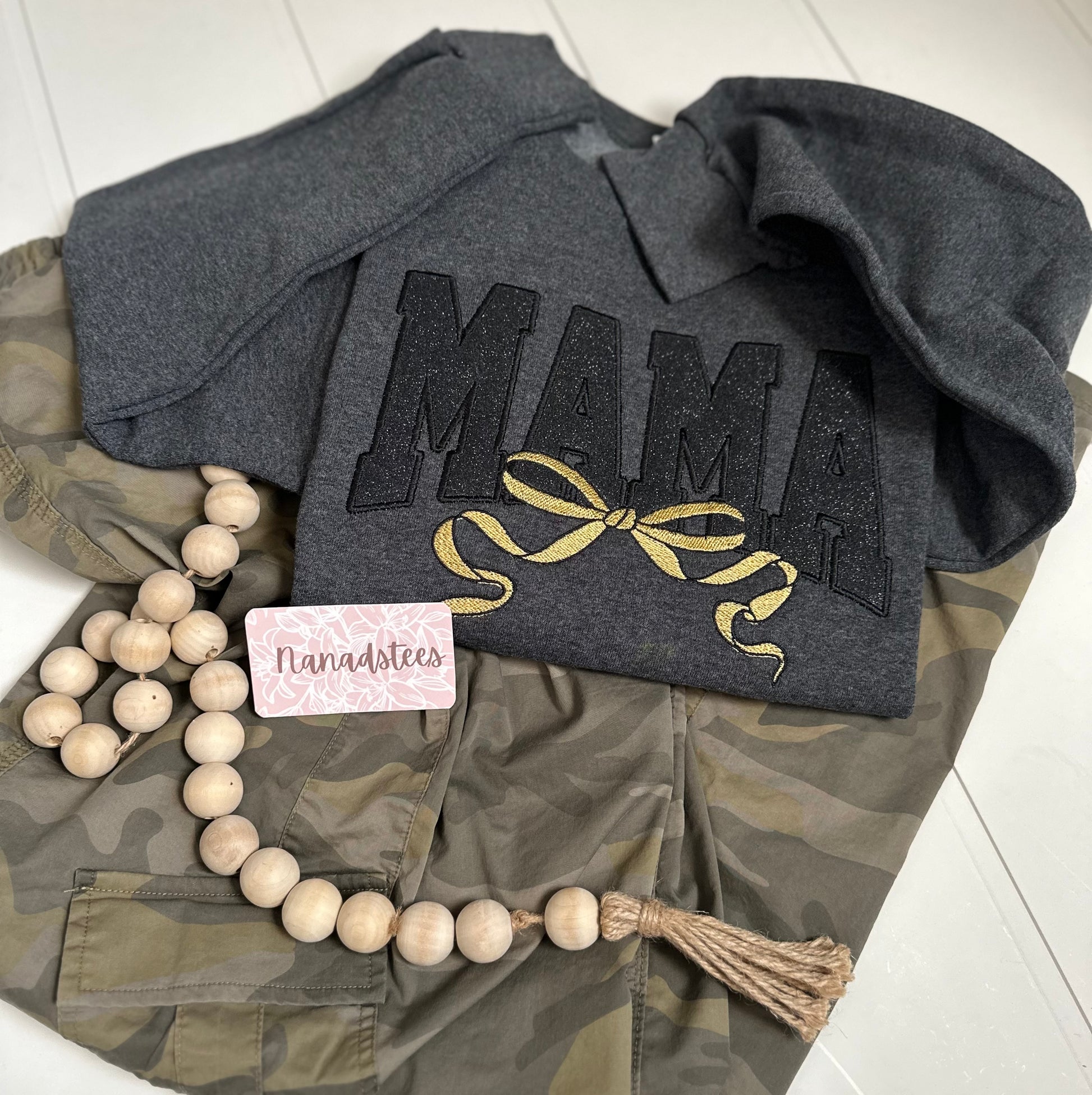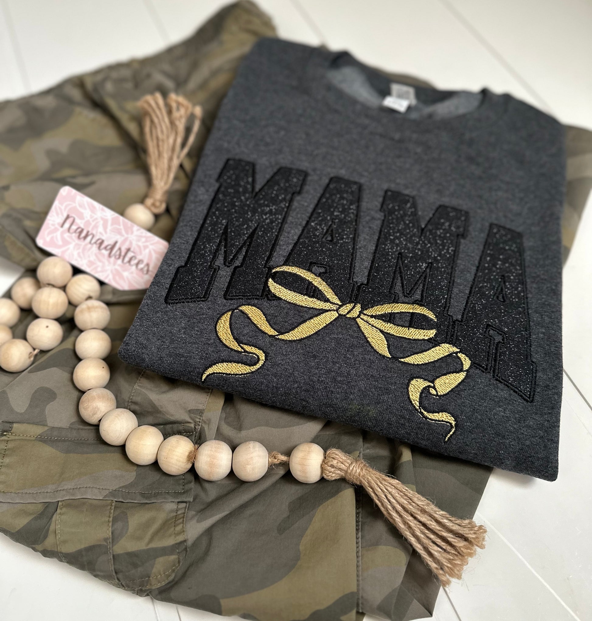 Add some sparkle to your wardrobe with the Mama Glitter Crew! Featuring an applique design, glitter accents, and a coquette bow, this crewneck is a must-have for any fashion-forward mama. With embroidery details adding a touch of femininity, this top is perfect for any occasion. Shine on, mama!