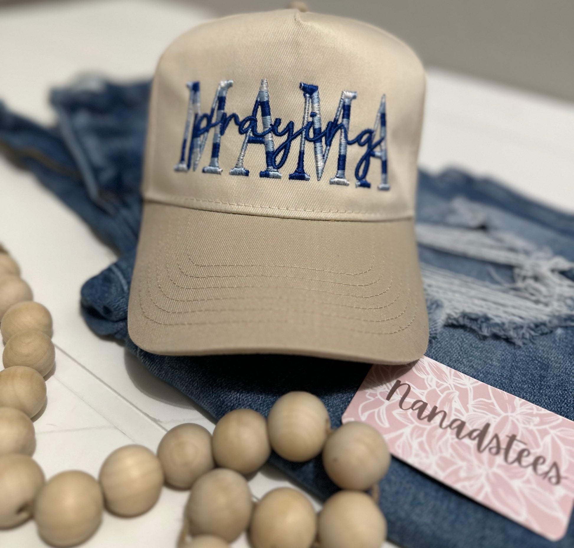 Rock this fun and faithful accessory with pride. The Praying Mama hat features bold embroidered lettering in white against a striking variegated blue base, creating eye-catching contrast that stands out. Perfect for the mom who juggles it all with grace and a little divine help, this hat brings together style and spirit in one wearable statement. Lightweight and adjustable, it's your go-to for casual outings, faith-filled gatherings, or just keeping the sun at bay while spreading good vibes.