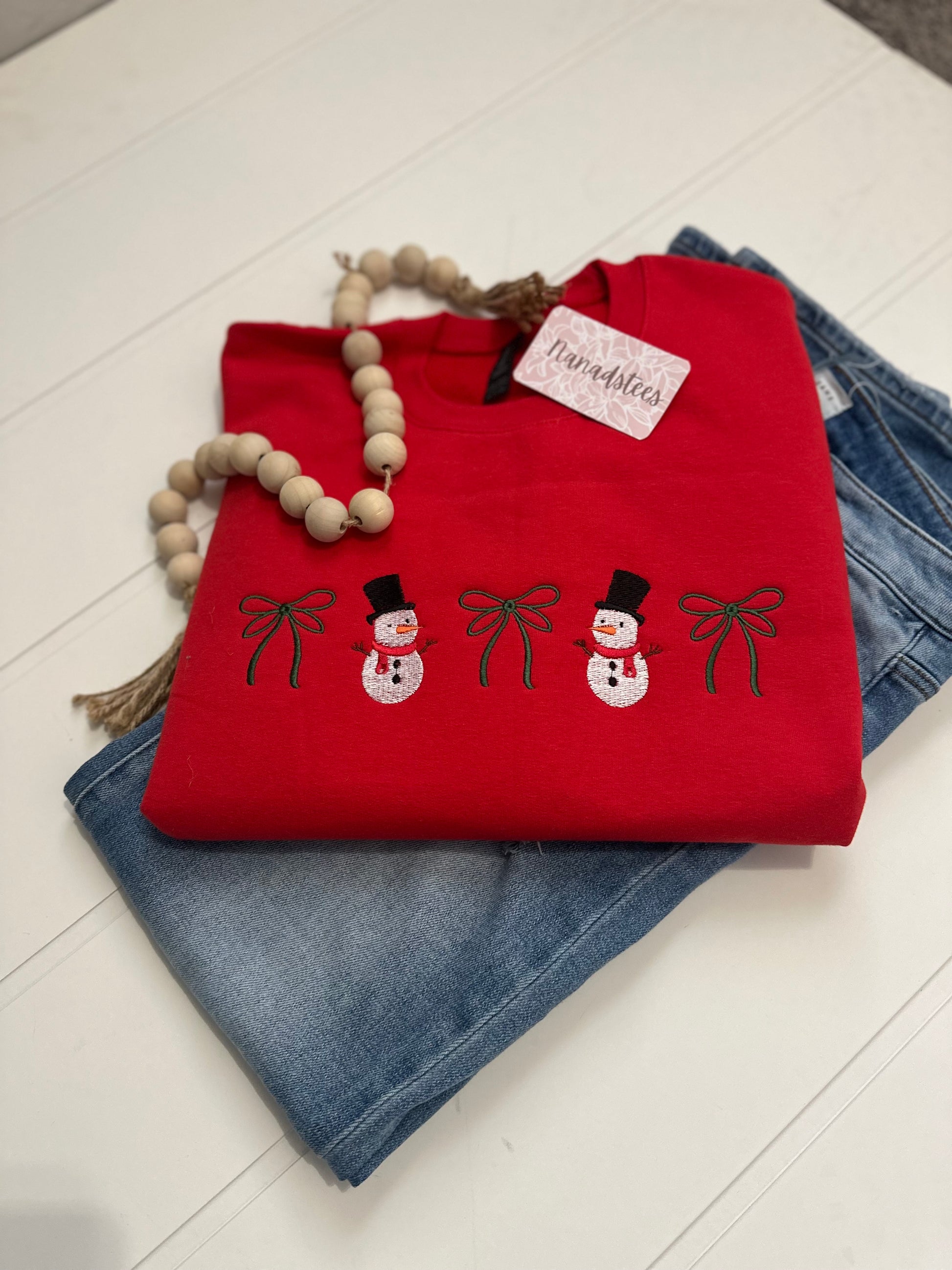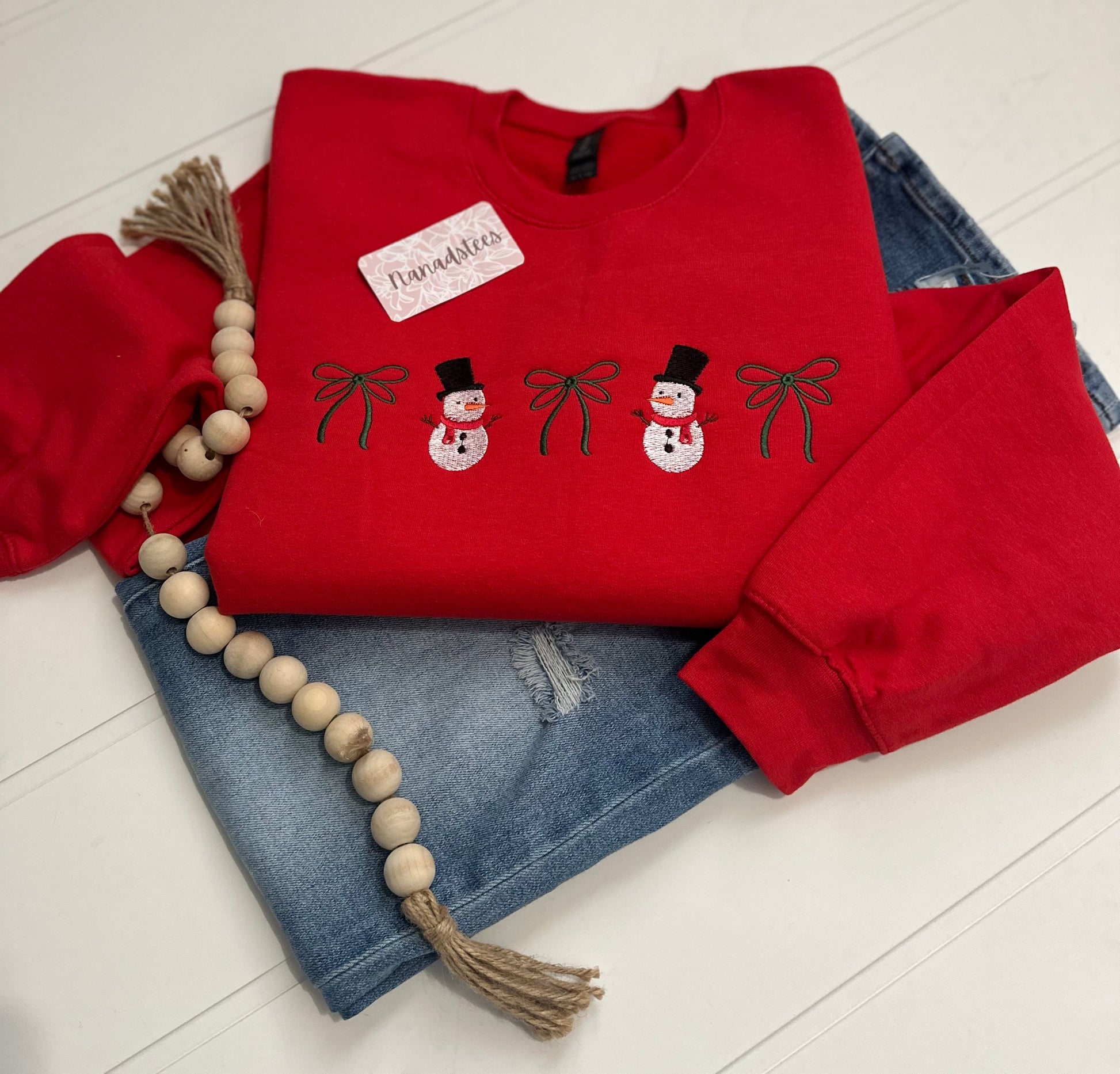 Embrace winter charm with this delightful crewneck sweatshirt featuring an adorable snowman sporting a signature coquette bow. The playful embroidered design brings festive flair to your cold-weather wardrobe, while the rich red fabric creates a striking contrast that makes this piece a standout. Perfect for holiday gatherings, cozy nights in, or spreading seasonal joy wherever you go. Soft, comfortable, and undeniably cute—your new favorite winter essential.